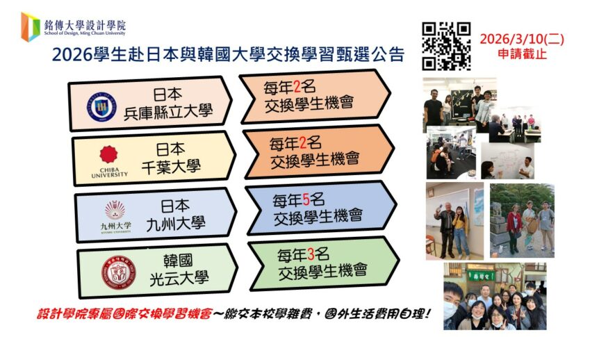 一、設計學院(以下簡稱本院)依據銘傳大學(以下簡稱本校)學則40條、出國進修交換學生計畫作業辦法,以及本院學生赴日本兵庫縣立大學減災復興政策研究所、千葉大學工程學院與九州大學藝術工學部、韓國光云大學交換學習計畫與甄選作業要點規定辦理。